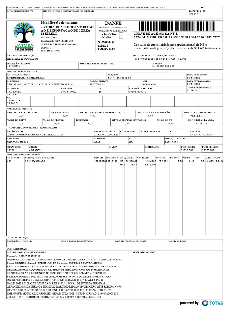 JATOBA COMERCIO IMP EXP DE CEREAIS LTDA 3-TRANSP PROP/REM 12.128.015/0002-08
