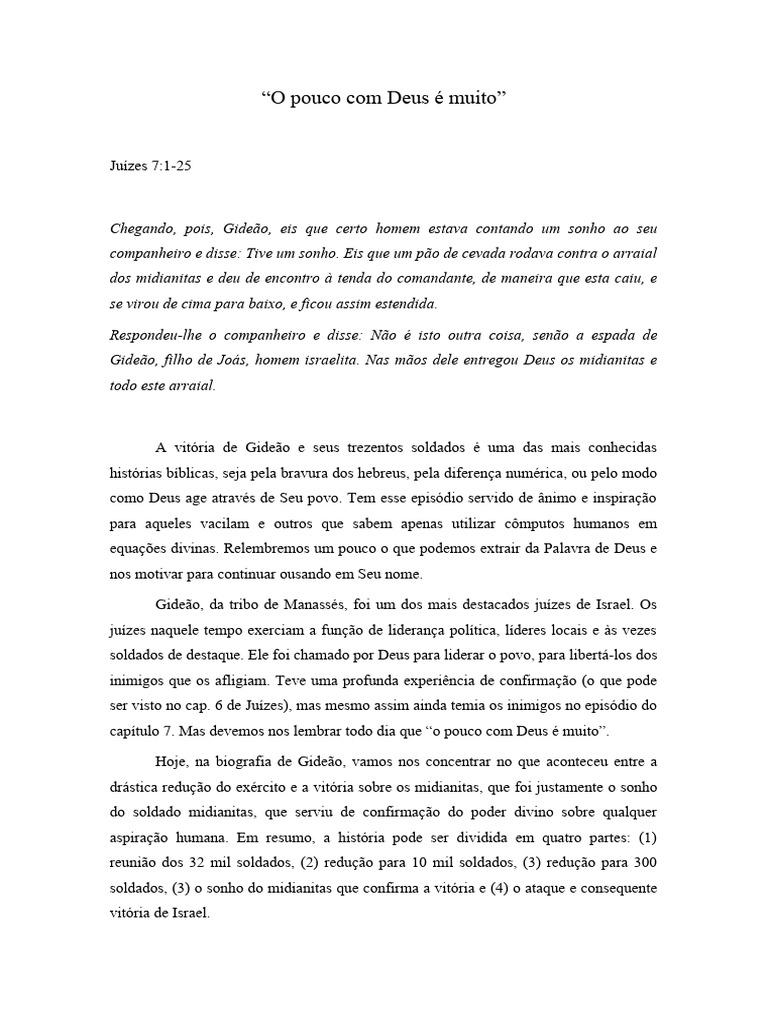 humana. Não olhe apenas para Gideão, olhe para a sua vida, reflita em quantas vezes