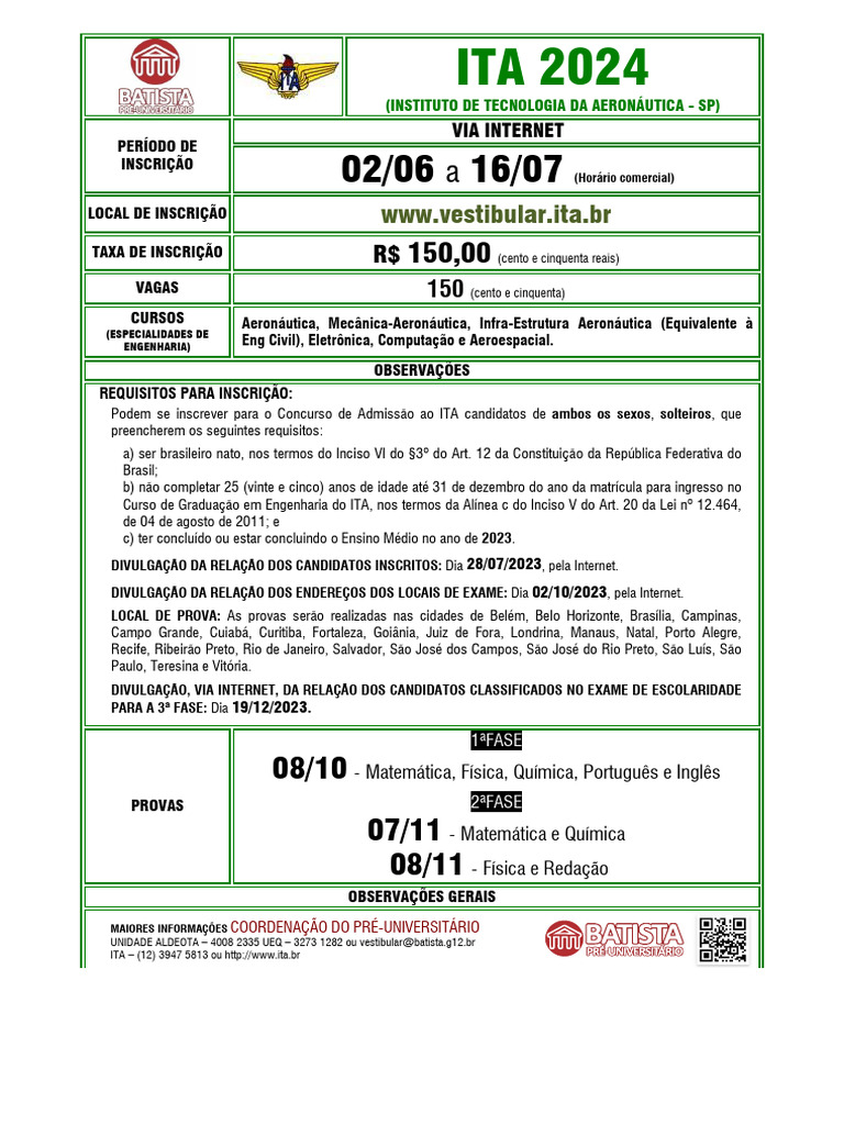 Podem se inscrever para o Concurso de Admissão ao ITA candidatos de ambos os sexos, solteiros, que