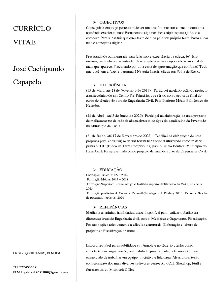 Estou disponível para mobilidade em Angola e no Exterior, tenho como
