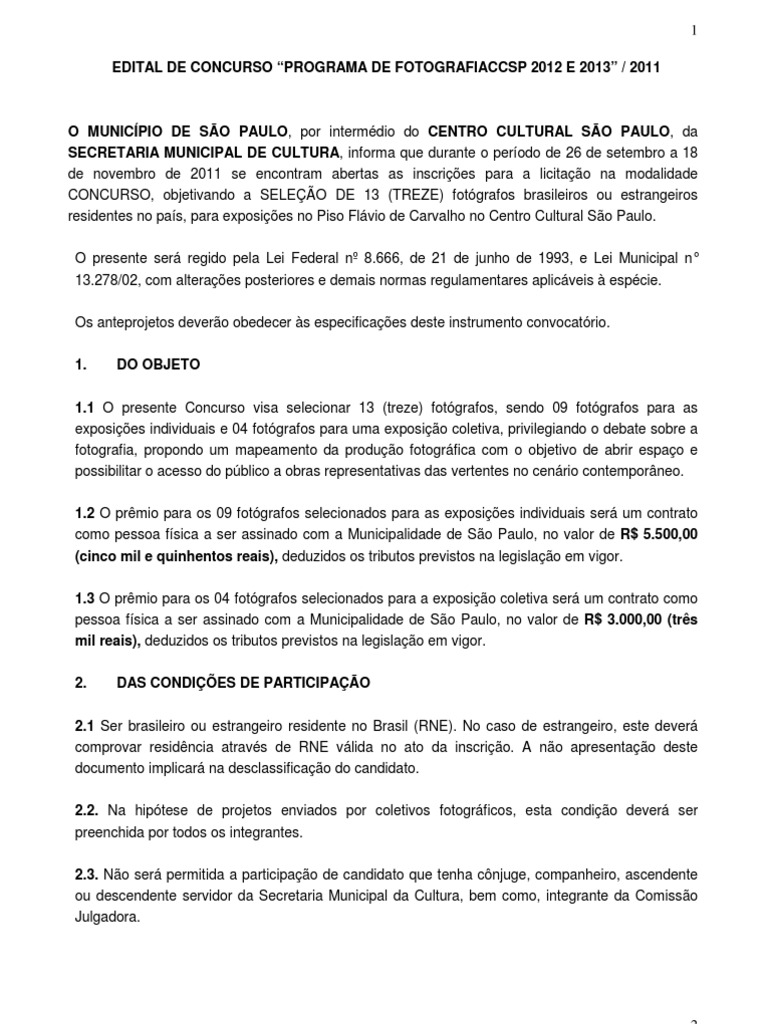 O MUNICPIO DE SO PAULO, por intermdio do CENTRO CULTURAL SO PAULO, da SECRETARIA MUNICIPAL DE CULTURA, informa que durante o perodo de 26 de setembro a 18 de novembro de 2011 se encontram abertas as inscries para a licitao na modalidade CONCURSO, objetivando a SELEO DE 13 (TREZE) fotgrafos brasileiros ou estrangeiros residentes no pas, para exposies no Piso Flvio de Carvalho no Centro Cultural So Paulo. O presente ser regido pela Lei Federal n 8.666, de 21 de junho de 1993, e Lei Municipal n 13.278/02, com alteraes posteriores e demais normas regulamentares aplicveis espcie. Os anteprojetos devero obedecer s especificaes deste instrumento convocatrio. 1. DO OBJETO