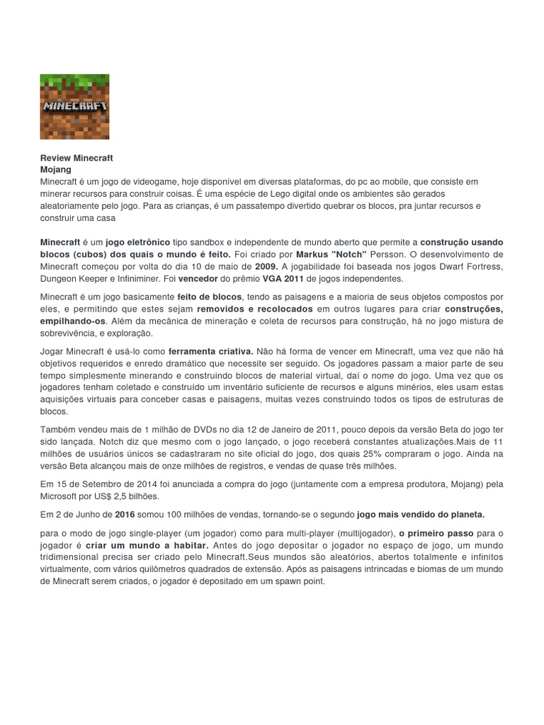 Minecraft é um jogo de videogame, hoje disponível em diversas plataformas, do pc ao mobile, que consiste em