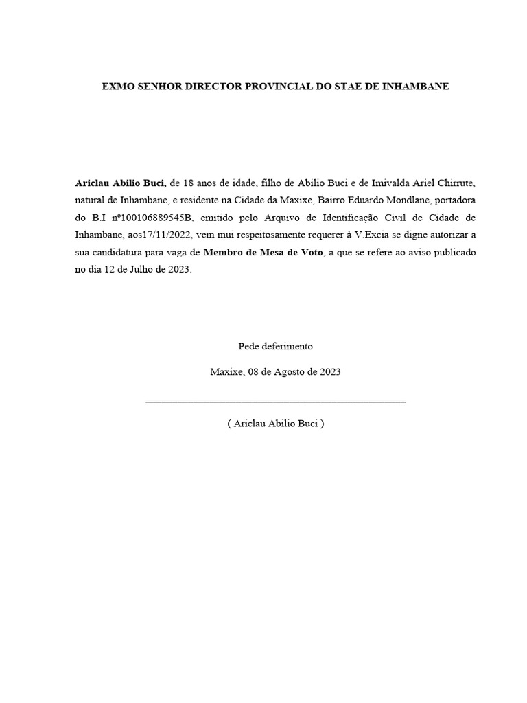 Inhambane, aos17/11/2022, vem mui respeitosamente requerer à [Link] se digne autorizar a