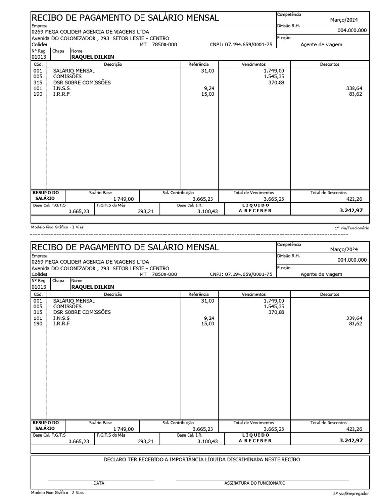 RECIBO DE PAGAMENTO DE SALÁRIO MENSAL Março/2024