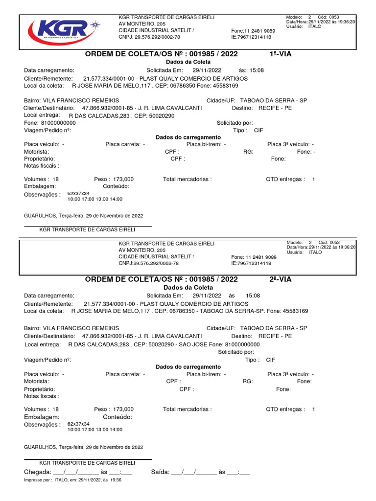 ORDEM DE COLETA/OS Nº : 001985 / 2022 2ª-VIA