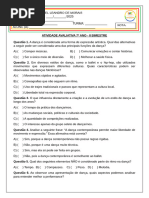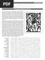 Improvisar na dana significa fazer movimentos de forma espontnea, sem planej-los anteriormente execuo 10) De acordo com Rudolf Laban(1879-1958) temos quatro formas bsicas de passarmos determinada emoo por meio de uma seqncia de movimentos na dana. Quais so essas formas? 1- por meio do modo peculiar de uso do instrumento, que o corpo; 2- por meio das direes tomadas pelos movimentos e pelas formas assim criadas; 3- por meio do desenvolvimento rtmico de toda a seqncia e do tempo no qual ela execu tada; 4- por meio da colocao de acentos e da organizao das frases. 11) Conceitue dana de salo e d exemplos: Uma das caractersticas marcantes da dana de salo o fato de ser danada aos pares, mesmo que os pares mudem durante a execuo. 13) Fale sobre as danas de salo: EST QUESTO SER APRESENTADA EM TRABALHO. 14.1) tango: 14.2) samba: 14.3) Forr: 14.4) Rumba: 14.5) Salsa: 14.6) Maxixe: 14) Fale sobre a dana Africana: As danas na frica so praticadas como atividade social ou religiosa. Existem muitos grupos na frica, o que reflete uma imensa variedade de estilos e tradies da dana por todo o territrio, tanto no que se refere aos espaos urbanos como rurais. Na frica o bailarino uma figura importante e respeitada, pois, alm de intrprete, ele professor, historiador, sacerdote, curandeiro e um contador de histrias. Ainda hoje continuam muito presentes as danas antigas que se referem a diversos rituais, como de fertilidade, caa, ritos de iniciao e crescimento, colheitas etc. Nesses casos a dana pode ser considerada uma forma de comunicao com os deuses ou como um estmulo ao transe, que coloca o danarino em contato direto com o mundo espiritual em que as tribos acreditam. As mscaras utilizadas em algumas danas tm a finalidade de transformar, durante o ritual, o bailarino em um deus ou em um esprito ancestral. Muitas das danas africanas assumem carter narrativo e a origem delas est no costume conservado pelos caadores de contar suas aventuras para o grupo. A coreografia narrativa pode referir-se a mitos da criao, relatar histrias morais ou simplesmente entreter e divertir. Alm disso, adana tambm praticada como uma atividade puramente esttica. 15) Fale sobre a dana Moderna: Vem desde 1900 apresentando uma grande variedade de estilos e muitas formas experimentais, baseada na liberdade de movimentos e expresso. Alguns anos mais tarde, surgiu o tango, depois o charleston (1920), nas dcadas de 1930 e 1940 danava-se o jitterbug e o swing. O rock'n roll em meados de 1950 e com o seu surgimento, os estilos de dana popular tornaram-se mais desenvoltos. Nas dcadas de 1960 e 1970, os negros criaram o twist, o hustle e muitas outras danas que os brancos adotaram com entusiasmo. A dana contempornea tudo aquilo que se faz hoje dentro dessa arte, no importa o estilo, procedncia, objetivos nem a forma. Para ser contemporneo no preciso buscar novos caminhos. So contemporneos tanto os coregrafos que usam a tcnica de Balanchine ou Bjart, como os que se inspiram em Martha Graham; eles se inspiram em qualquer fonte: sua viso pessoal, a literatura e suas observaes.