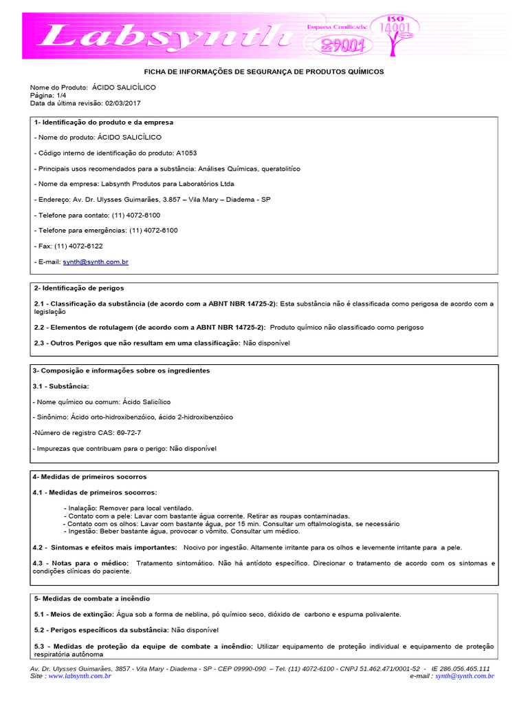 - Nome do produto: ÁCIDO SALICÍLICO