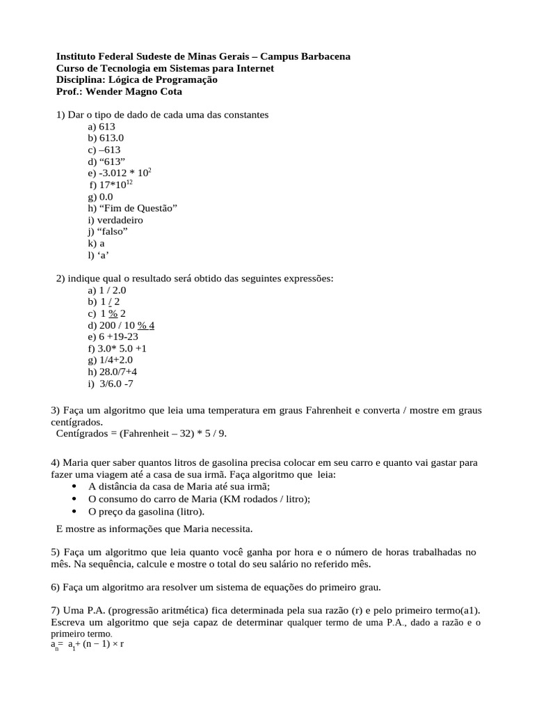 Disciplina: Lógica de Programação