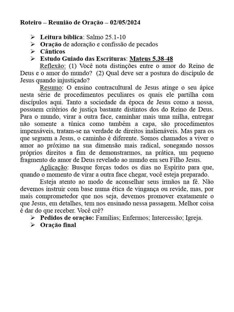 Roteiro – Reunião de Oração – 02/05/2024