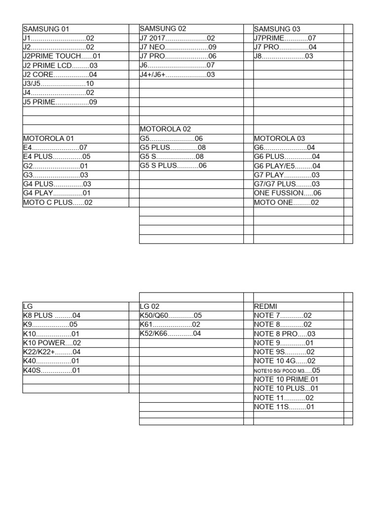 K40..................01 NOTE 10 4G......02