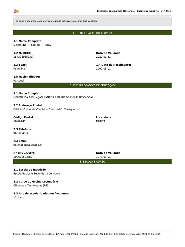 Exames Nacionais - Ensino Secundário - 1.ª Fase - 2023/2024 | Data de Inscrição: 2024-03-05 19:24 | Data de Impressão: 2024-03-05 19:25