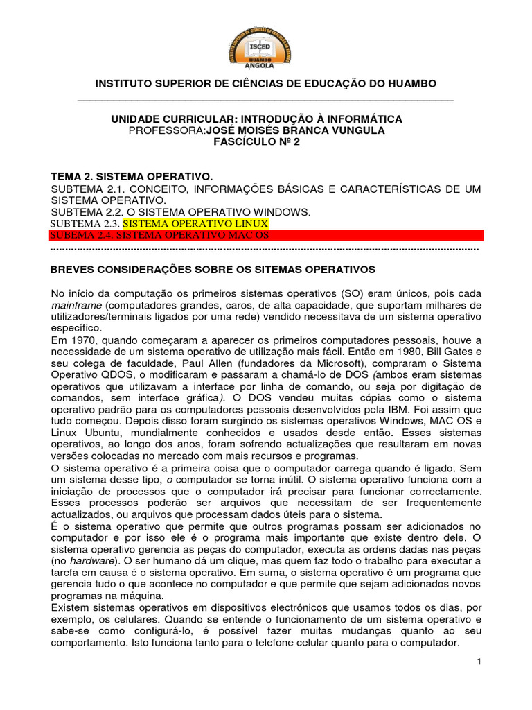 tudo começou. Depois disso foram surgindo os sistemas operativos Windows, MAC OS e