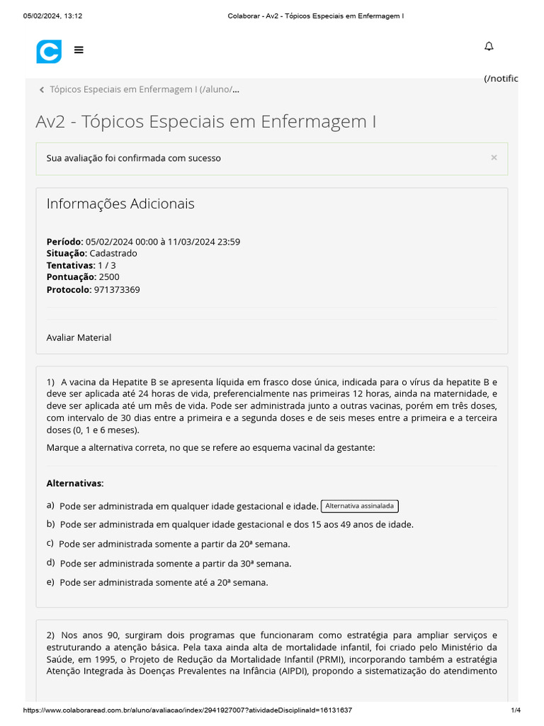 05/02/2024, 13:12 Colaborar - Av2 - Tópicos Especiais em Enfermagem I