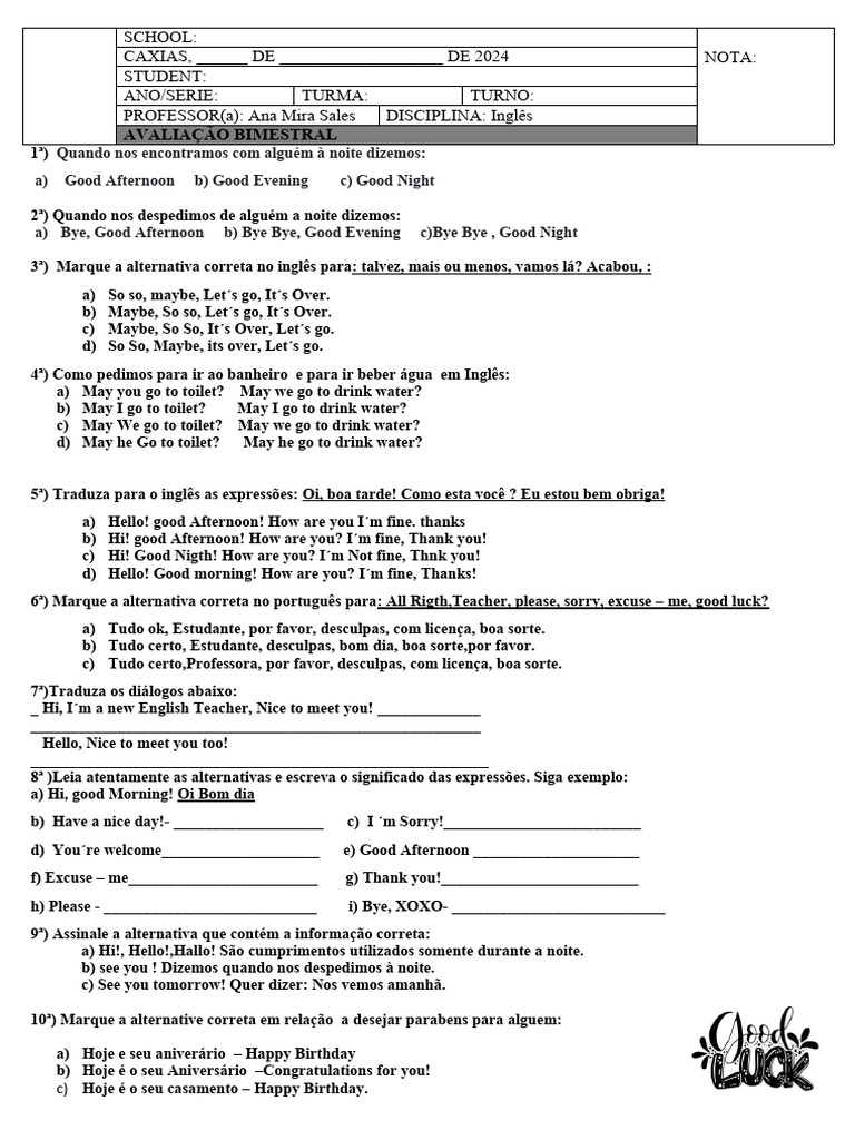 6ª) Marque a alternativa correta no português para: All Rigth,Teacher, please, sorry, excuse – me, good luck?