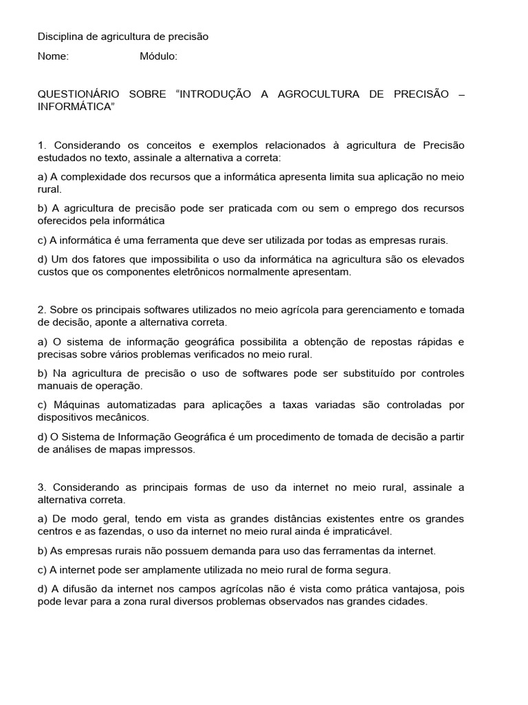 QUESTIONÁRIO SOBRE “INTRODUÇÃO A AGROCULTURA DE PRECISÃO –