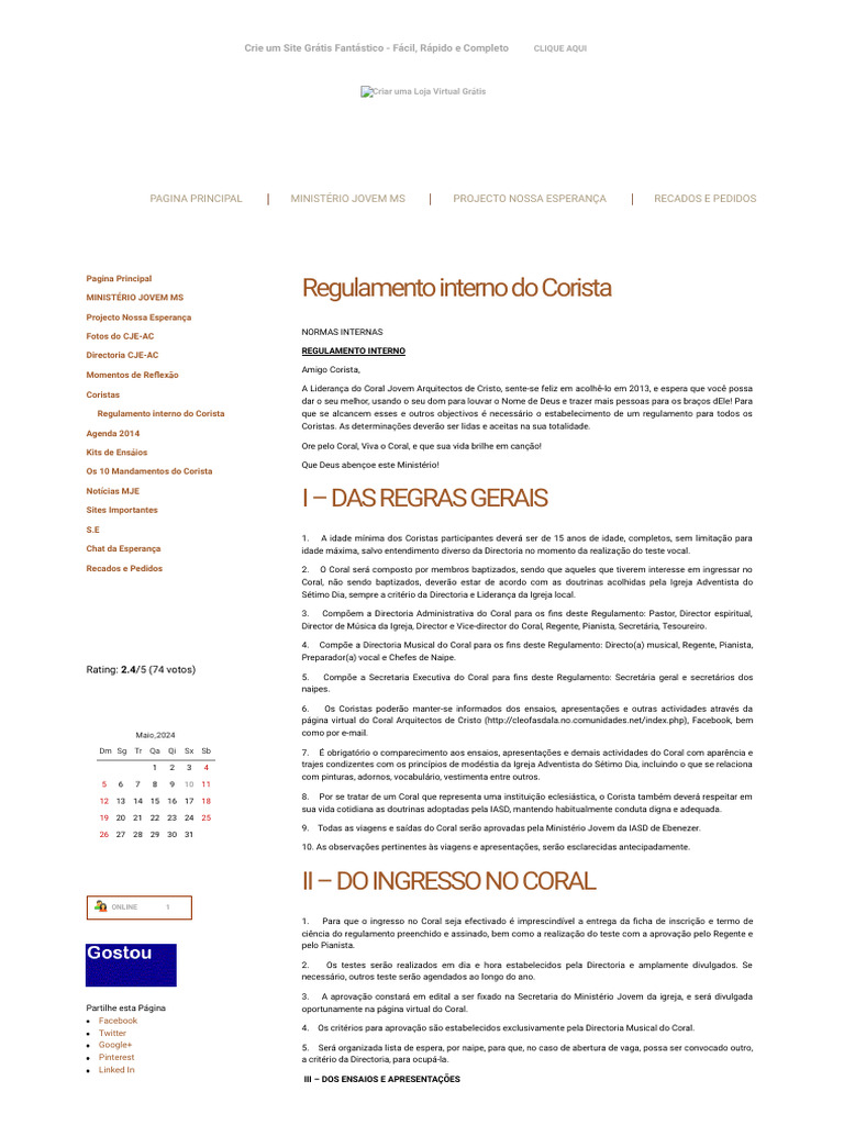 9. Todas as viagens e saídas do Coral serão aprovadas pela Ministério Jovem da IASD de Ebenezer.