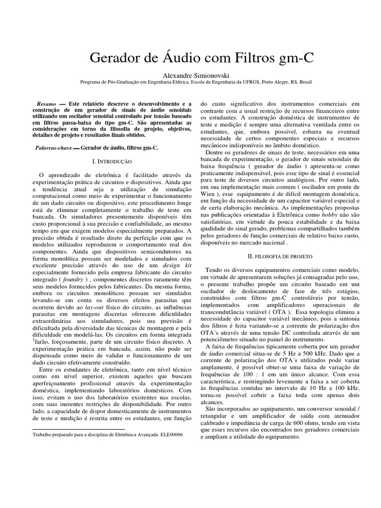 Palavras-chave Gerador de áudio, filtros gm-C. mecânicos indisponíveis no âmbito doméstico.