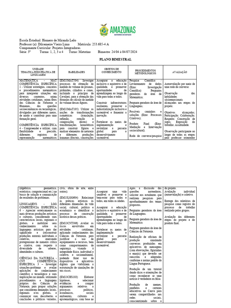 Série: 3ª Turma: 1, 2, 3 e 4 Turno: Matutino Bimestre: 24/04 à 04/07/2024