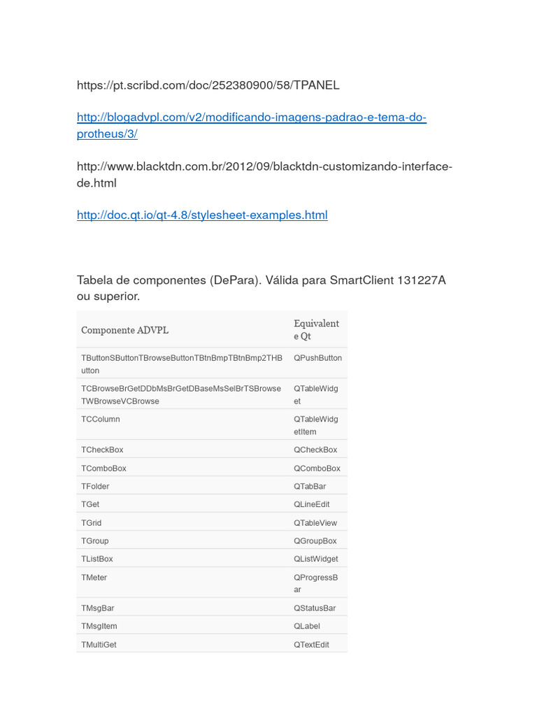 Tabela de componentes (DePara). Válida para SmartClient 131227A
