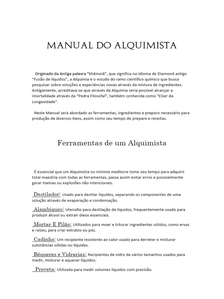 Nesta sessão, serão abordadas algumas receitas básicas para Alquimistas iniciantes e