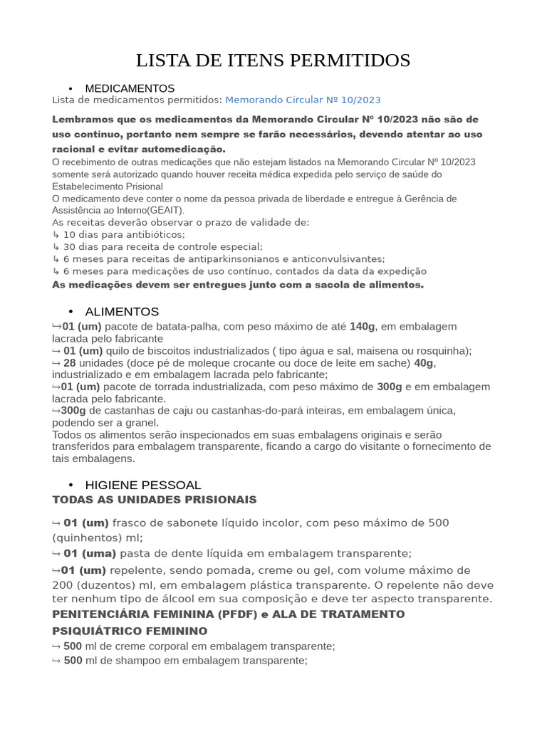 LISTA DE ITENS PERMITIDOS