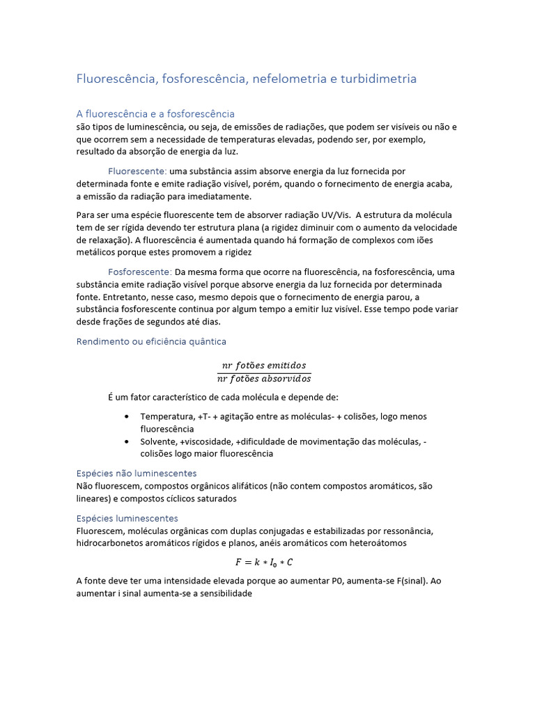 Fluorescência, fosforescência, nefelometria e turbidimetria