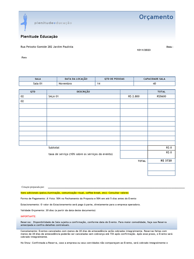 Cancelamento: Eventos cancelados com menos de 20 dias de antecedência serão cobrados integralmente. Reservas feitas com