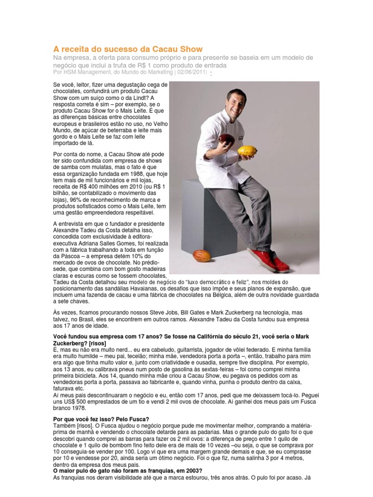 Por HSM Management, do Mundo do Marketing | 02/06/2011| Se voc, leitor, fizer uma degustao cega de chocolates, confundir um produto Cacau Show com um suo como o da Lindt? A resposta correta sim por exemplo, se o produto Cacau Show for o Mais Leite. que as diferenas bsicas entre chocolates europeus e brasileiros esto no uso, no Velho Mundo, de acar de beterraba e leite mais gordo e o Mais Leite se faz com leite importado de l. Por conta do nome, a Cacau Show at pode ter sido confundida com empresa de shows de samba com mulatas, mas o fato que essa organizao fundada em 1988, que hoje tem mais de mil funcionrios e mil lojas, receita de R$ 400 milhes em 2010 (ou R$ 1 bilho, se contabilizado o movimento das lojas), 96% de reconhecimento de marca e produtos sofisticados como o Mais Leite, tem uma gesto empreendedora respeitvel. A entrevista em que o fundador e presidente Alexandre Tadeu da Costa detalha isso, concedida com exclusividade editoraexecutiva Adriana Salles Gomes, foi realizada com a fbrica trabalhando a toda em funo da Pscoa a empresa detm 10% do mercado de ovos de chocolate. No prdiosede, que combina com bom gosto madeiras claras e escuras como se fossem chocolates, Tadeu da Costa detalhou seu modelo de negcio do luxo democrtico e feliz, nos moldes do posicionamento das sandlias Havaianas, os desafios que isso impe e seus planos de expanso, que incluem uma fazenda de cacau e uma fbrica de chocolates na Blgica, alm de outra novidade guardada a sete chaves. s vezes, ficamos procurando nossos Steve Jobs, Bill Gates e Mark Zuckerberg na tecnologia, mas talvez, no Brasil, eles se encontrem em outros ramos. Alexandre Tadeu da Costa fundou sua empresa aos 17 anos de idade. Voc fundou sua empresa com 17 anos? Se fosse na Califrnia do sculo 21, voc seria o Mark Zuckerberg? [risos] , mas eu no era muito nerd... eu era cabeludo, guitarrista, jogador de vlei federado. E minha famlia era muito humilde meu pai, tecelo; minha me, vendedora porta a porta , ento, trabalho para mim era algo que tinha muito valor e, junto com criatividade e ousadia, sempre tive disciplina. Por exemplo, aos 13 anos, eu calibrava pneus num posto de gasolina s sextas-feiras foi como comprei minha primeira bicicleta. Aos 14, quando minha me criou a Cacau Show, eu pegava os pedidos com as vendedoras porta a porta, passava ao fabricante e, quando vinha, punha o produto dentro da caixa, faturava etc. A meus pais descontinuaram o negcio e eu, ento com 17 anos, pedi que me deixassem toc-lo. Peguei uns US$ 500 emprestados de um tio e vendi 2 mil ovos de chocolate. A ganhei dos meus pais um Fusca branco 1978. Por que voc fez isso? Pelo Fusca? Tambm [risos]. O Fusca ajudou o negcio porque pude me movimentar melhor, comprando a matriaprima de manh e vendendo o chocolate detarde para as padarias. Mas o grande pulo do gato foi o que descobri quando comprei as barras para fazer os 2 mil ovos: a diferena de preo entre 1 quilo de chocolate e 1 quilo de bombom fino feito dele era de mais de 10 vezes ou seja, o que se comprava por 10 conseguia-se vender por 100. Logo vi que era uma margem grande demais e que, se eu comprasse por 10 e vendesse por 20, ainda seria um timo negcio. Foi o que fiz, numa salinha 3 por 4 metros, dentro da empresa dos meus pais. O maior pulo do gato no foram as franquias, em 2003? As franquias nos deram visibilidade at que a marca estourou, trs anos atrs. O pulo foi por acaso. J