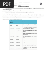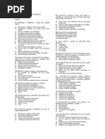d) os meninos saram do cinema calados; e) os alunos estavam preocupados. 24. Na orao Voc ficar tuberculoso, de tuberculose morrer, as palavras grifadas so, respectivamente: a) adjunto adverbial de modo, adjunto adverbial de causa; b) objeto direto, objeto indireto; c) predicativo do sujeito, adjunto adverbial; d) ambas predicativas; e) n.d.a. 25. Em: O Presidente corrupto saiu cedo. a) o verbo de ligao, e o termo grifado ncleo do predicado; b) o verbo intransitivo e o termo grifado adjunto adverbial; c) o verbo transitivo direto e o termo grifado objeto direto; d) o verbo intransitivo e o termo grifado objeto indireto; e) o verbo de ligao e o termo grifado objeto indireto. 26. Na orao a situao continua indefinida: a) o verbo de ligao e o predicado nominal; b) o verbo intransitivo e o predicado verbo-nominal; c) o verbo transitivo direto e o predicado verbal; d) o verbo bitransitivo e o predicado verbo-nominal e) o verbo transitivo direto e o predicado verbal.