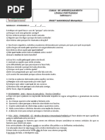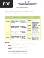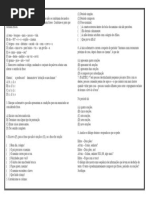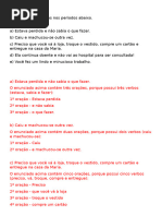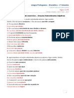 de: a) objeto direto; b) sujeito; c) adjunto adnominal; d) complemento nominal; e) objeto indireto. 13. O sol entra cada dia mais tarde, plido, fraco, oblquo O sol brilhou um pouquinho pela manh. Pela ordem, os predicados das oraes acima classificam-se como: a) nominal verbo nominal; b) verbal nominal; c) verbal verbo-nominal; d) verbo-nominal nominal; e) verbo-nominal verbal. 14. exemplo de predicado verbo-nominal: a) cuspi no cho com um nojo desgraado; b) o corpo me doa todo; c) Estela se sentou na cama assustada; d) E ele saiu correndo com os ps descalos; e) Chico Sena morreu. 15. Em: o professor entrou atrasado a) o verbo intransitivo e o predicado nominal; b) o verbo transitivo direto e o predicado verbal; c) o verbo de ligao e o predicado nominal; d) o verbo intransitivo e o predicado verbo-nominal; e) o verbo transitivo indireto e o predicado verbal. 16. Na expresso . . . chamei Armando Nogueira de carioca . . . encontramos no predicado pela ordem: a) objeto direto e objeto indireto; b) objeto direto e predicativo; c) objeto indireto e adjunto adnominal; d) objeto indireto e predicativo; e) objeto direto e adjunto adverbial. 17. Minha terra pindorama, de Palmares sempre em flor ! a) o predicado nominal e o verbo de ligao; b) o predicado verbal e o verbo intransitivo; c) o predicado verbal e o verbo de ligao;