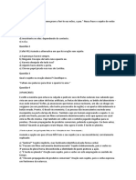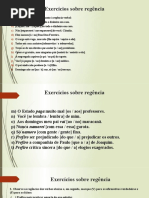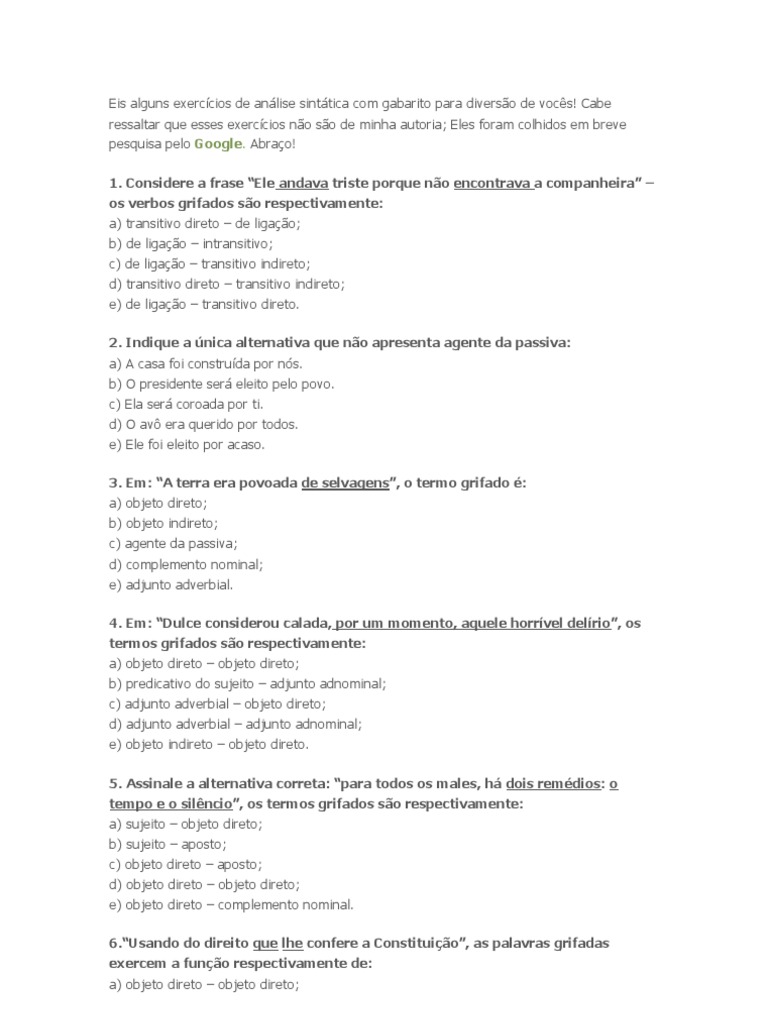 Cabe ressaltar que esses exerccios no so de minha autoria; Eles foram colhidos em breve pesquisa pelo Google. Abrao! 1. Considere a frase Ele andava triste porque no encontrava a companheira os verbos grifados so respectivamente: a) transitivo direto de ligao; b) de ligao intransitivo; c) de ligao transitivo indireto; d) transitivo direto transitivo indireto; e) de ligao transitivo direto. 2. Indique a nica alternativa que no apresenta agente da passiva: a) A casa foi construda por ns. b) O presidente ser eleito pelo povo. c) Ela ser coroada por ti. d) O av era querido por todos. e) Ele foi eleito por acaso. 3. Em: A terra era povoada de selvagens, o termo grifado : a) objeto direto; b) objeto indireto; c) agente da passiva; d) complemento nominal; e) adjunto adverbial. 4. Em: Dulce considerou calada, por um momento, aquele horrvel delrio, os termos grifados so respectivamente: a) objeto direto objeto direto; b) predicativo do sujeito adjunto adnominal; c) adjunto adverbial objeto direto; d) adjunto adverbial adjunto adnominal; e) objeto indireto objeto direto. 5. Assinale a alternativa correta: para todos os males, h dois remdios: o tempo e o silncio, os termos grifados so respectivamente: a) sujeito objeto direto; b) sujeito aposto; c) objeto direto aposto; d) objeto direto objeto direto; e) objeto direto complemento nominal. 6.Usando do direito que lhe confere a Constituio, as palavras grifadas exercem a funo respectivamente de: a) objeto direto objeto direto;