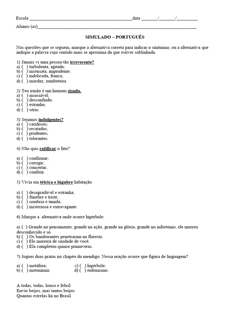 Nas questões que se seguem, marque a alternativa correta para indicar o sinônimo, ou a alternativa que
