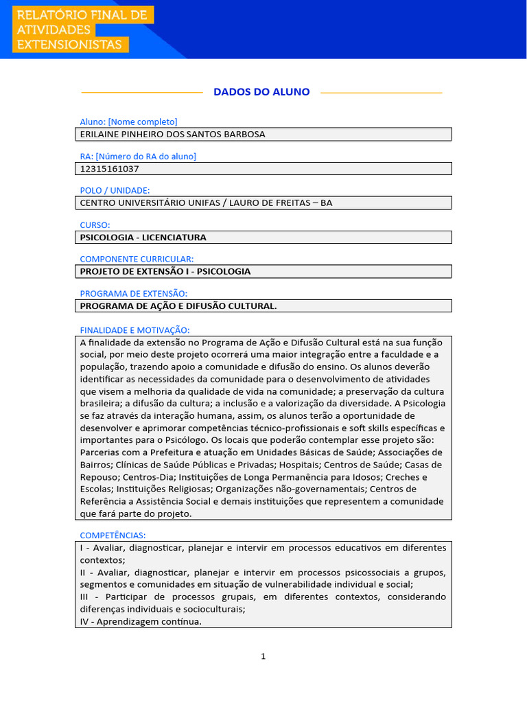 PROJETO DE EXTENSÃO I - PSICOLOGIA
