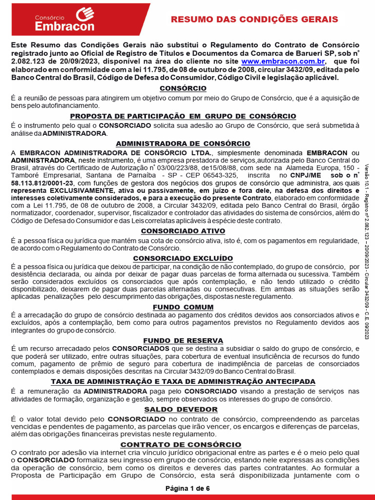 Este Resumo das Condições Gerais não substitui o Regulamento do Contrato de Consórcio