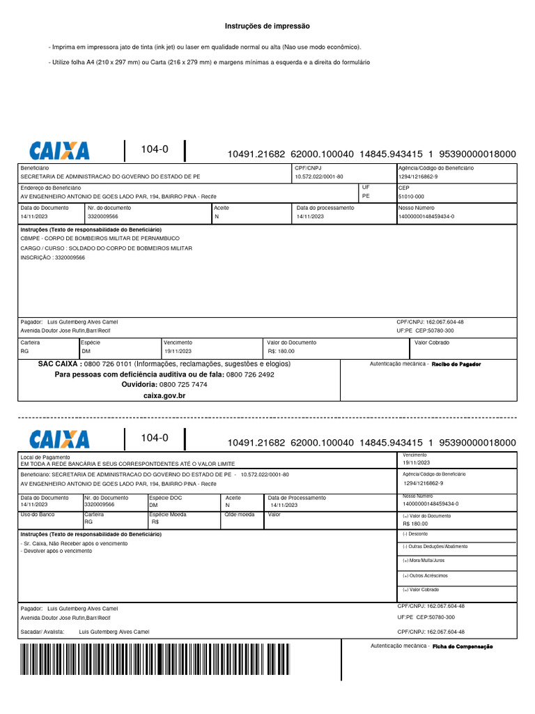 Beneficiário: SECRETARIA DE ADMINISTRACAO DO GOVERNO DO ESTADO DE PE - 10.572.022/0001-80 Agência/Código do Beneficiário
