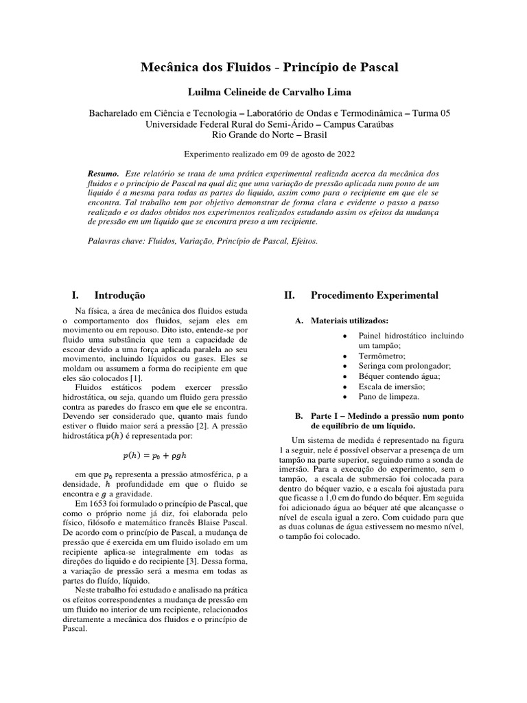 Palavras chave: Fluidos, Variação, Princípio de Pascal, Efeitos.