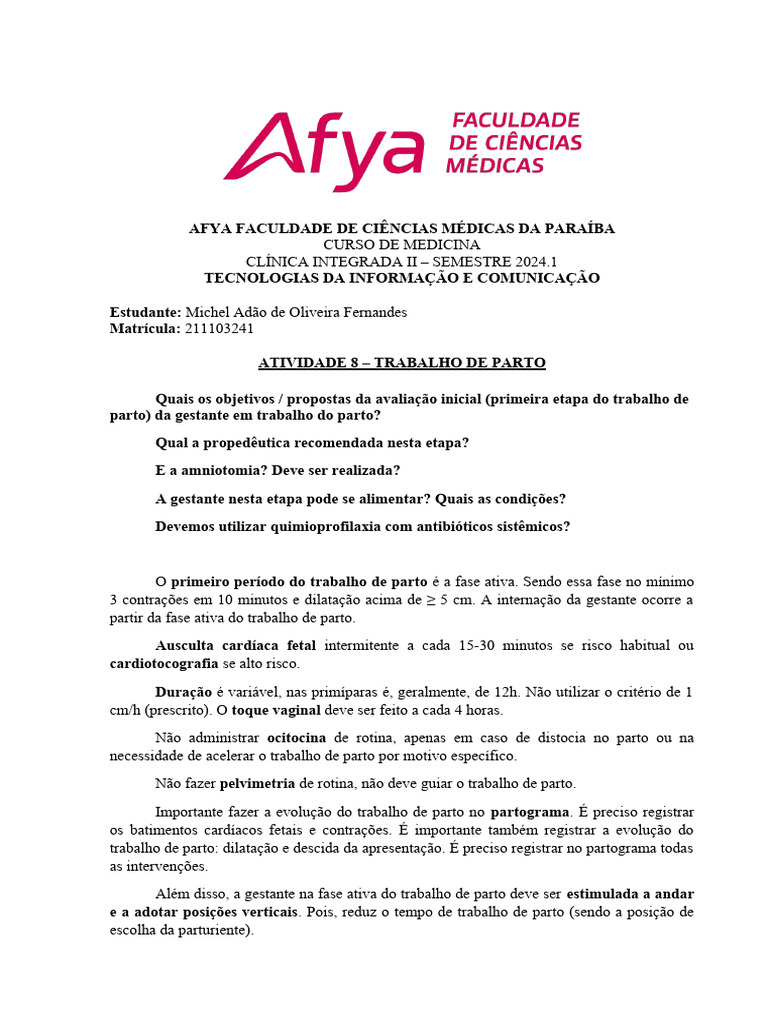 ATIVIDADE 8 – TRABALHO DE PARTO