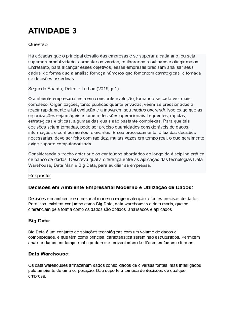 Warehouse, Data Mart e Big Data, para auxiliar as empresas.