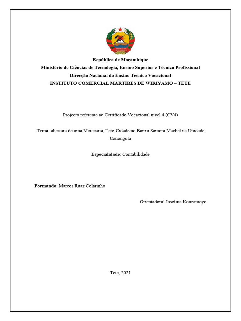 Tema: abertura de uma Mercearia, Tete-Cidade no Bairro Samora Machel na Unidade