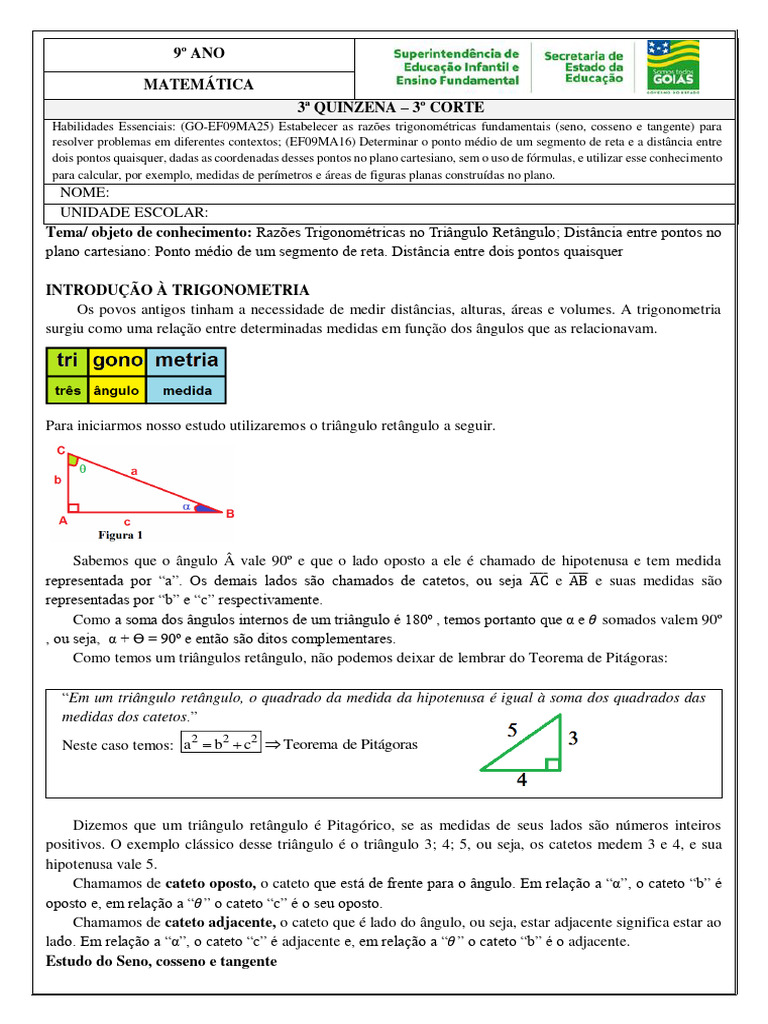 Habilidades Essenciais: (GO-EF09MA25) Estabelecer as razões trigonométricas fundamentais (seno, cosseno e tangente) para