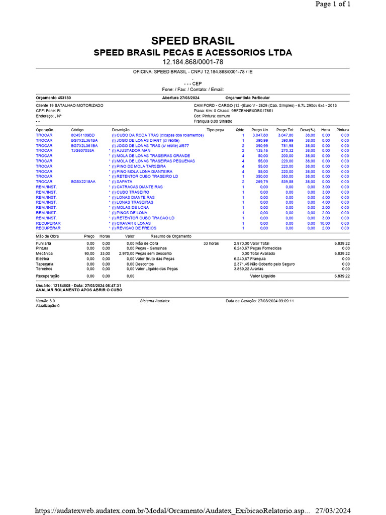 Mecânica 90,00 33,00 2.970,00 Peças sem desconto 0,00 Total Avaliado 6.839,22