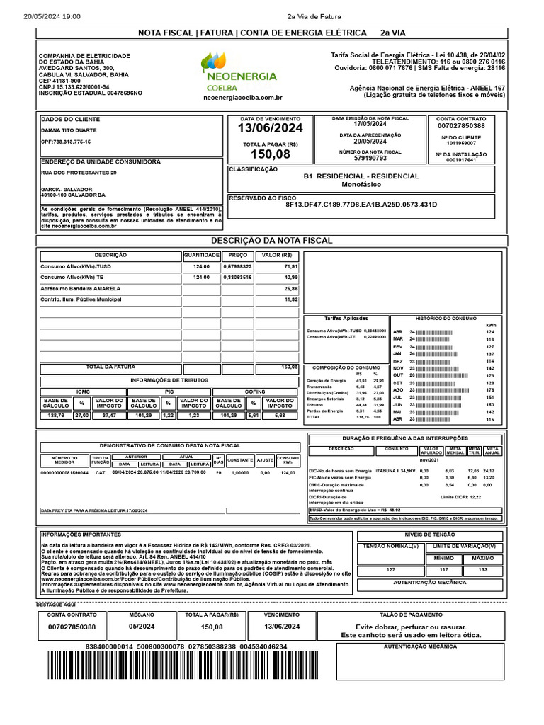 NOTA FISCAL | FATURA | CONTA DE ENERGIA ELÉTRICA 2a VIA