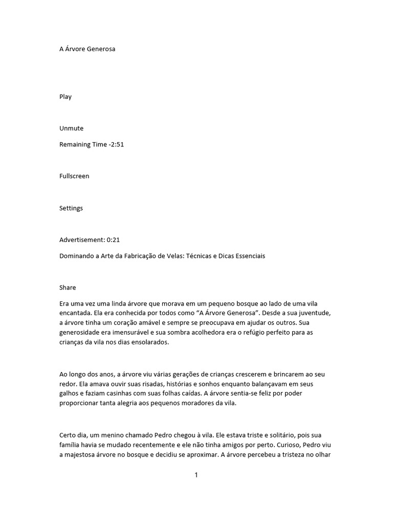 histórias e memórias. A Árvore Generosa ensinou a Pedro a importância da generosidade,