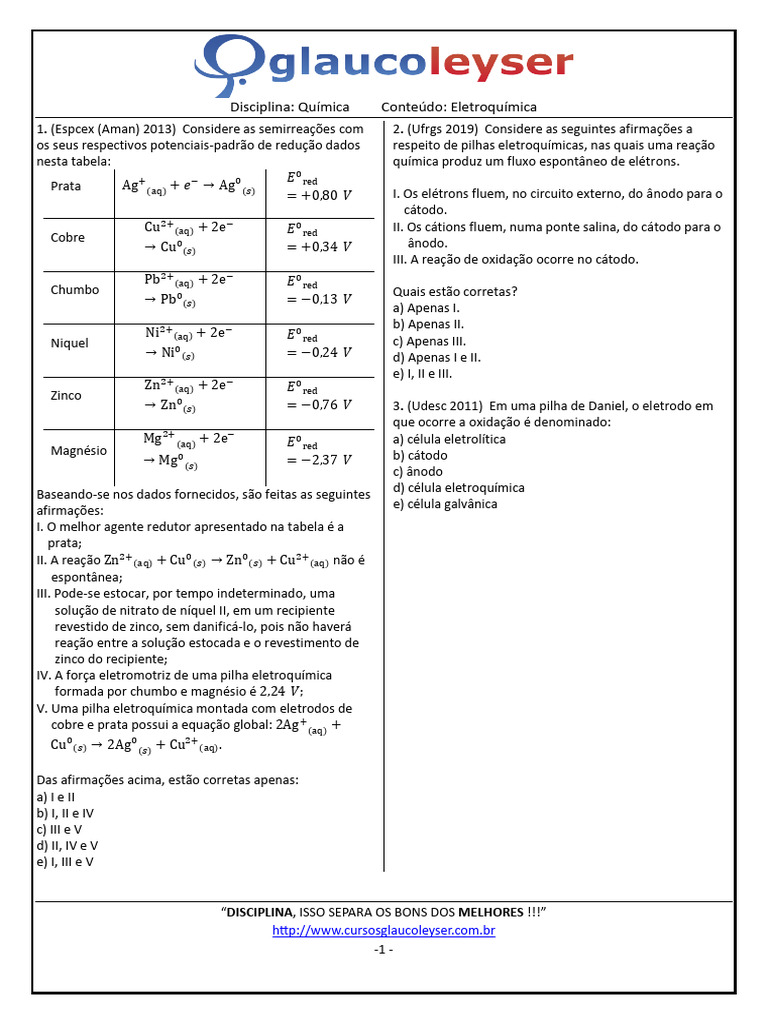 1. (Espcex (Aman) 2013) Considere as semirreações com 2. (Ufrgs 2019) Considere as seguintes afirmações a