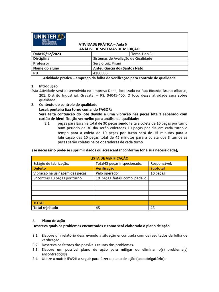Atividade prática – emprego da folha de verificação para controle de qualidade
