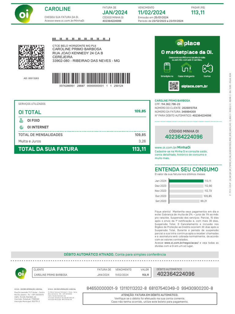 Fatura Oi Jan/2024 - Valor e Vencimento