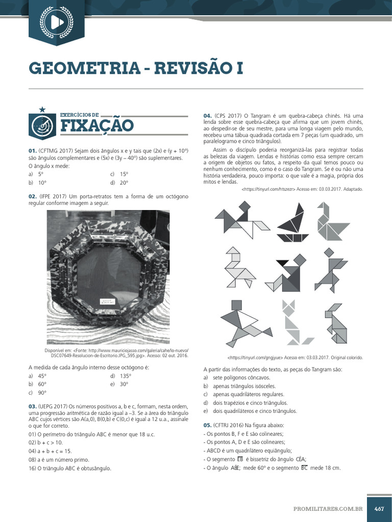 01. (CFTMG 2017) Sejam dois ângulos x e y tais que (2x) e (y + 10°) Assim o discípulo poderia reorganizá-las para registrar todas