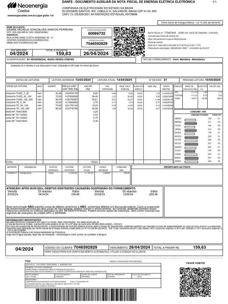 CÓDIGO DO CLIENTE 7046592829 VENCIMENTO 26/04/2024 TOTAL A PAGAR R$ 159,63