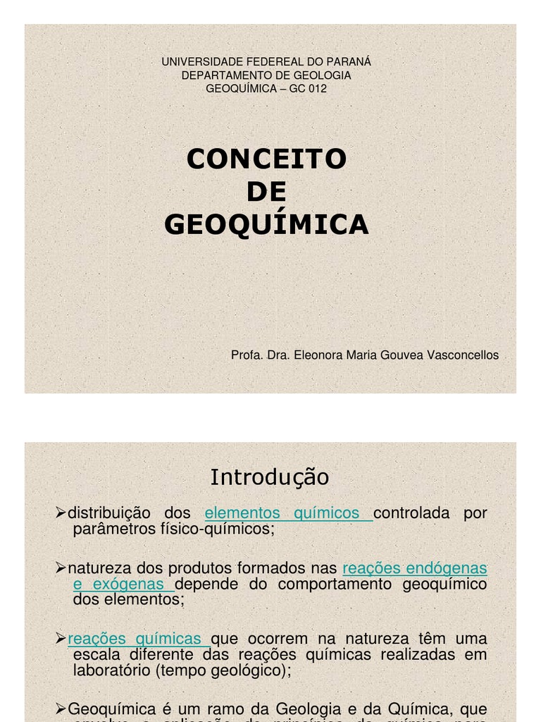 distribuio dos elementos qumicos controlada por parmetros fsico-qumicos; natureza dos produtos formados nas reaes endgenas e exgenas depende do comportamento geoqumico dos elementos; reaes qumicas que ocorrem na natureza tm uma escala diferente das reaes qumicas realizadas em laboratrio (tempo geolgico); Geoqumica um ramo da Geologia e da Qumica, que envolve a aplicao de princpios da qumica para solucionar problemas de geologia, permitindo um conhecimento mais exato dos fenmenos qumicos que tem lugar na natureza.
