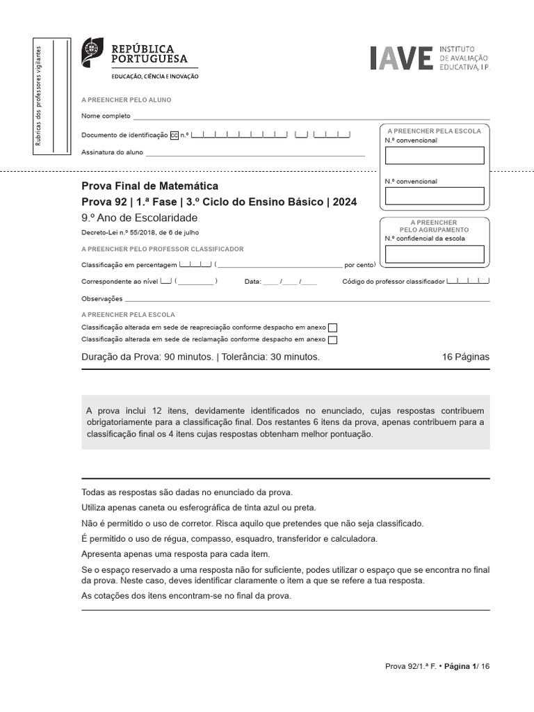 Prova 92 | 1.ª Fase | 3.º Ciclo do Ensino Básico | 2024